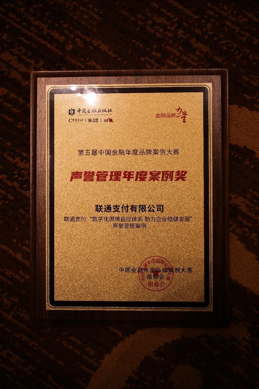 近日,中國金融品牌年會暨第五屆中國金融年度品牌案例大賽頒獎典禮在北京圓滿落幕。本次大賽中,聯(lián)通支付有限公司(簡稱“聯(lián)通支付”)憑借《數(shù)字化輿情監(jiān)控體系助力企業(yè)穩(wěn)健發(fā)展聲譽(yù)管理案例》榮獲聲譽(yù)管理年度案例獎,聯(lián)通支付已蟬聯(lián)四次該獎項(xiàng)。