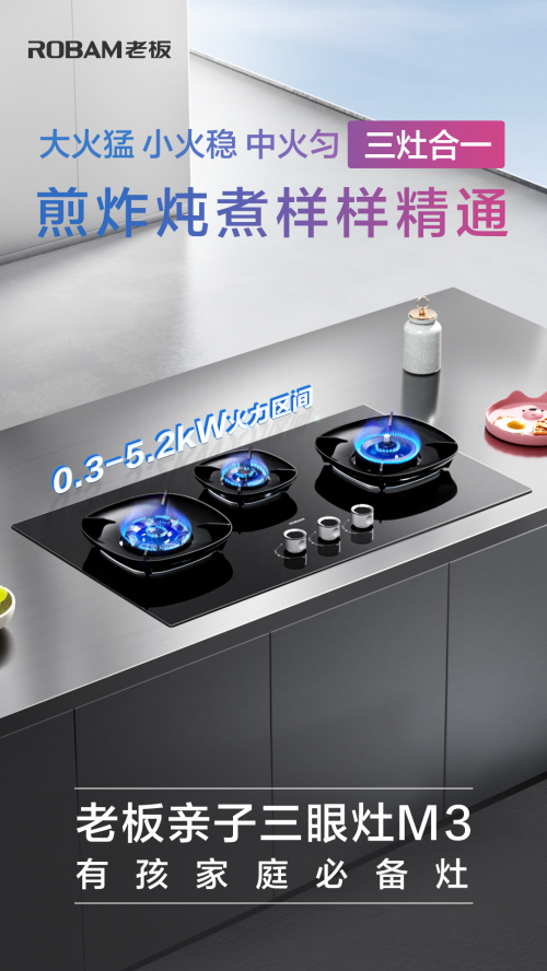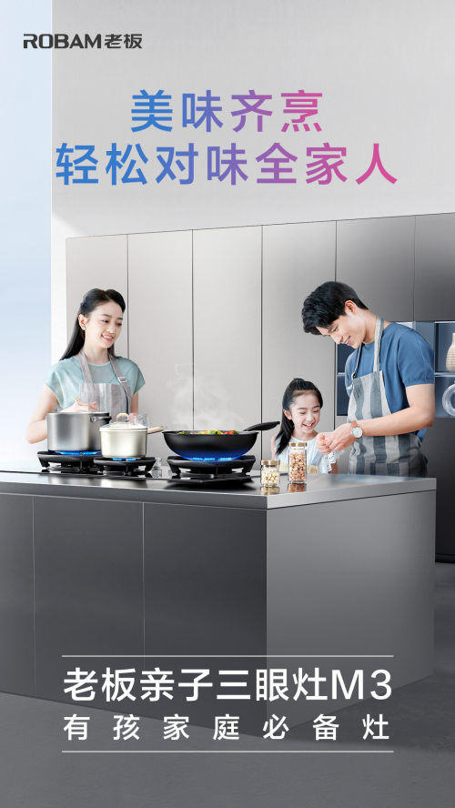 有娃家庭人口多烹飪?nèi)蝿?wù)重,孩子吃的小分量食物烹飪難度大,且多代同堂對烹飪技法要求高。老板親子三眼灶M3的發(fā)布,讓眾多難題迎刃而解,烹飪變得趣味無窮,廚房生活更輕松。