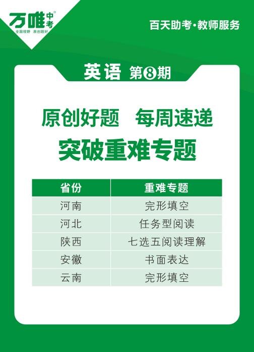 為使師生在中考前更加精準、高效地備考,3月15日—6月9日期間,萬唯中考持續(xù)為河南、河北、陜西、安徽、云南5省區(qū)初三師生推送七科原創(chuàng)好題等資料,截至目前,已有超3萬名老師每周通過所在的微信群獲取。