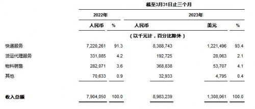 ?收入總額 為人民幣8,983.2百萬(wàn)元(1,308.1百萬(wàn)美元),較2022年同期的人民幣7,904.1百萬(wàn)元增長(zhǎng)13.7%。核心快遞服務(wù)收入較2022年同期增長(zhǎng)16.1%,該增長(zhǎng)是由于包裹量增長(zhǎng)20.5%及單票價(jià)格下降3.7%的綜合影響所致。貨運(yùn)代理服務(wù)收入較2022年同期減少41.8%,該減少主要是由于全球經(jīng)濟(jì)疲弱導(dǎo)致跨境電商需求和定價(jià)下降所致。物料銷(xiāo)售收入主要由打印電子面單所需的熱敏紙銷(xiāo)售收入組成,同比增長(zhǎng)30.8%,該等增長(zhǎng)與包裹量增長(zhǎng)趨勢(shì)吻合。其他收入主要由金融貸款業(yè)務(wù)組成。