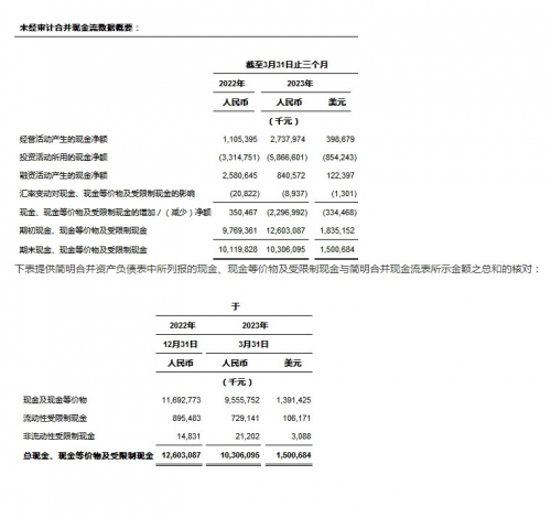 ? 經(jīng)營(yíng)活動(dòng)產(chǎn)生的現(xiàn)金凈額為人民幣2,738.0百萬(wàn)元(398.7百萬(wàn)美元),而2022年同期為人民幣1,105.4百萬(wàn)元。