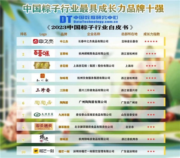 6月14日,中國數(shù)據(jù)研究中心發(fā)布“2023中國粽子行業(yè)最具成長力品牌十強(qiáng)榜”,中之杰躋身榜單第一名,上榜的還有百草味、杏花樓等知名粽子品牌。