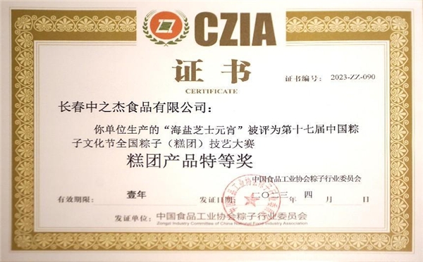 2023年4月19日,中之杰再次驚艷亮相中國粽子文化節(jié),一舉斬獲三項(xiàng)全國大獎(jiǎng)。中之杰的梅肉黑松露粽作為創(chuàng)新產(chǎn)品,從原料、工藝、口感、顏值等各個(gè)方面都受到行業(yè)專家推崇,同時(shí)斬獲全國(糕團(tuán))技藝大賽雙冠王——大賽最高獎(jiǎng)項(xiàng)“粽子產(chǎn)品特等獎(jiǎng)”和“粽子產(chǎn)品創(chuàng)新獎(jiǎng)”,中之杰海鹽芝士炸不爆元宵榮獲全國(糕團(tuán))技藝大賽最高獎(jiǎng)項(xiàng)“糕團(tuán)產(chǎn)品特等獎(jiǎng)”。