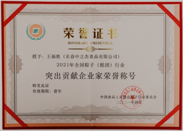有鑒于中之杰長久以來對弘揚(yáng)粽子文化事業(yè)的貢獻(xiàn),在2021年,中之杰董事長王福勝先生獲得機(jī)構(gòu)頒發(fā)的“突出貢獻(xiàn)企業(yè)家”稱號,體現(xiàn)出中之杰在行業(yè)內(nèi)的領(lǐng)軍實(shí)力和頂流水平。王福勝還帶領(lǐng)中之杰分別榮獲 “長春民營經(jīng)濟(jì)突出貢獻(xiàn)企業(yè)”和“民營經(jīng)濟(jì)突出貢獻(xiàn)企業(yè)家”等榮譽(yù)。同時(shí),王福勝還擔(dān)任中國食品工業(yè)協(xié)會(huì)粽子行業(yè)委員會(huì)會(huì)長職務(wù),為行業(yè)發(fā)展盡職盡責(zé)。