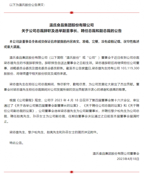 4月18日,溫氏股份第四屆董事會第十六次會議順利召開,會議由溫氏股份董事長溫志芬主持,全體董事參加會議,監(jiān)事列席。經(jīng)記名投票表決,會議審議通過了《關(guān)于選舉公司第四屆董事會副董事長的議案》《關(guān)于聘任公司總裁的議案》和《關(guān)于聘任公司副總裁的議案》三項(xiàng)議案。根據(jù)表決結(jié)果,梁志雄先生當(dāng)選公司副董事長,聘任黎少松先生為公司總裁,聘任趙亮先生、孫芬女士為公司副總裁,任期自董事會決議通過之日起至本屆董事會屆滿時(shí)止。