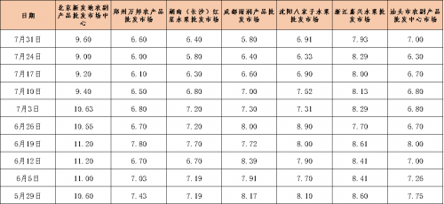從全國來看,當(dāng)前國內(nèi)夏季水果供應(yīng)較為充足,近期國內(nèi)水果交易價格整體處于較低水平,本期農(nóng)業(yè)農(nóng)村部監(jiān)測的6種重點監(jiān)測水果價格跌幅收窄。截至7月31日,農(nóng)業(yè)農(nóng)村部監(jiān)測的6種水果(富士蘋果、巨峰葡萄、香蕉、菠蘿、西瓜、鴨梨)批發(fā)均價報7.35元/公斤,較7月24日下跌0.94%。