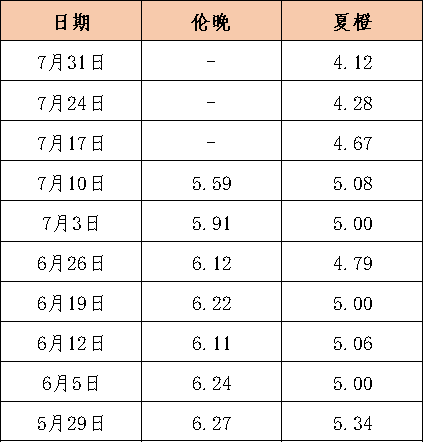 在產(chǎn)地收購方面,截至7月27日,秭歸夏橙已銷售本產(chǎn)季產(chǎn)量的59.38%,走貨速度整體低于去年同期。受降雨天氣影響,貿(mào)易商采購意愿減弱,夏橙收購價格及收購量下降。本期秭歸夏橙收購量環(huán)比下跌17.49%。價格方面,本期夏橙收購價格報4.12元/公斤,環(huán)比下跌3.69%,同比下跌34.10%。