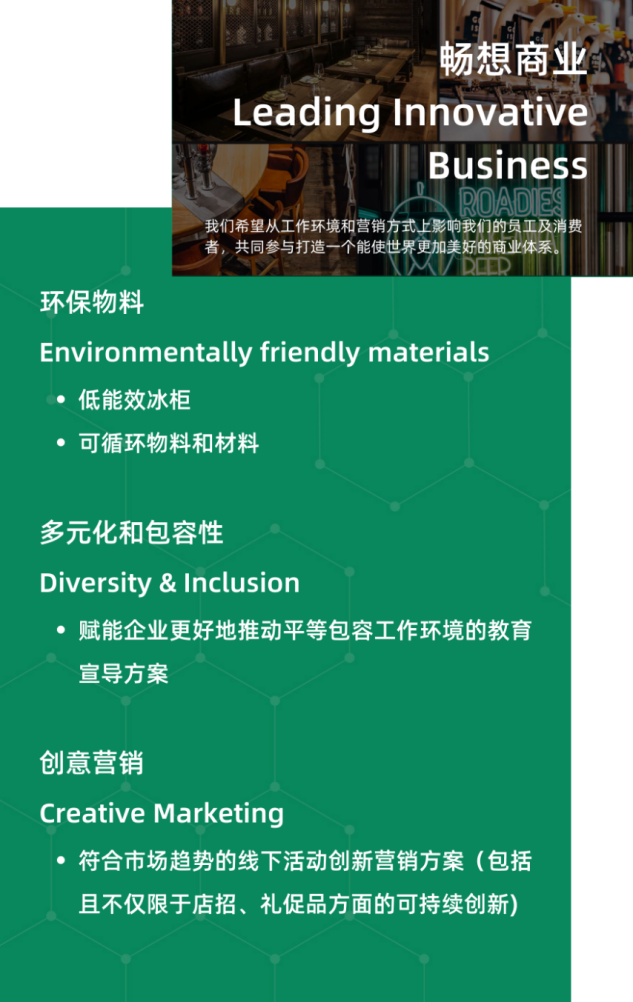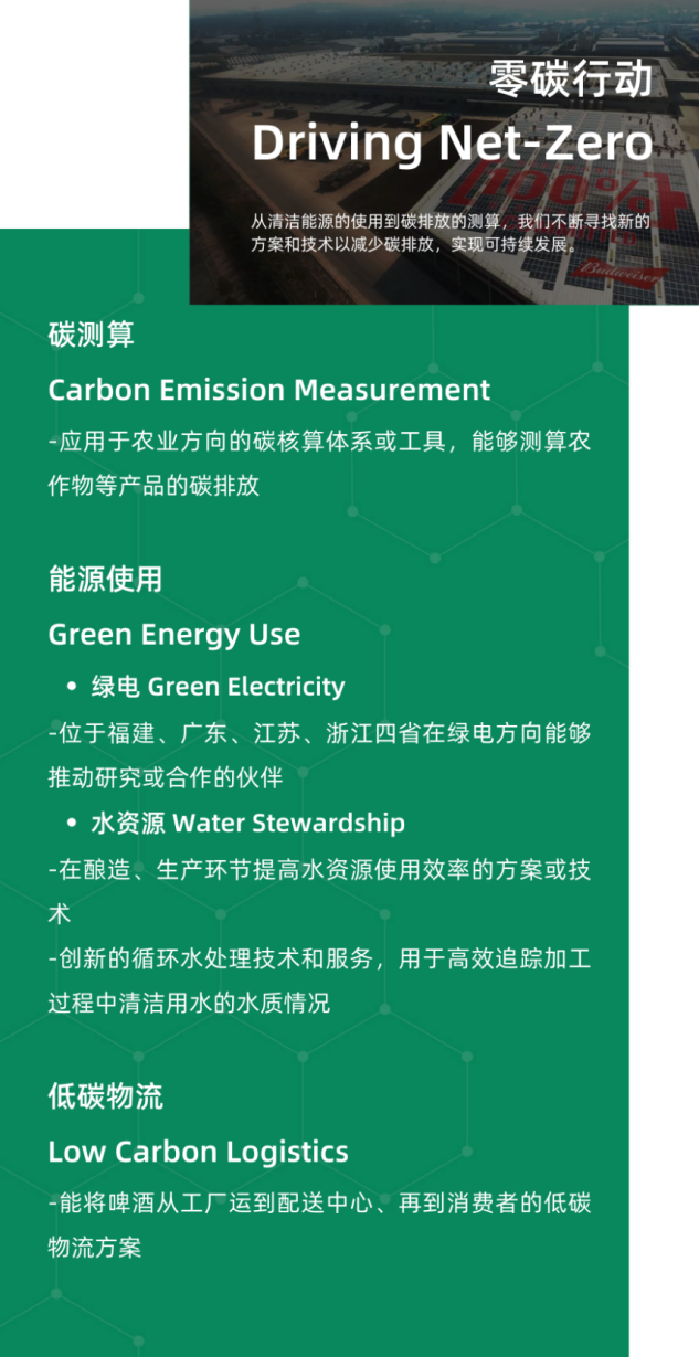 每一年,100+創(chuàng)新中心都會在價值鏈上梳理亟待解決的可持續(xù)發(fā)展挑戰(zhàn)議題并公開招募創(chuàng)新解決方案,目標是讓你的想法得到驗證并實現(xiàn)商業(yè)化應(yīng)用,在試點完成后能夠獲得更大的商業(yè)合同,與百威中國以及更多伙伴建立強有力的合作。