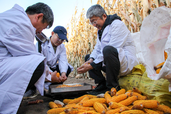 中國農(nóng)業(yè)科學(xué)院作物栽培與生理創(chuàng)新團(tuán)隊(duì)首席專家李少昆研究員(右一)在通遼市開魯縣一處千畝片示范田開展工作。記者 連振 攝