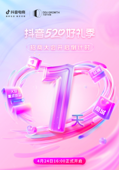為給商家提前蓄勢520,擴(kuò)寬商家經(jīng)營生意場,「抖音520好禮季」招商大會將于4月24日16點(diǎn)正式召開,屆時將為商家披露全域億級流量扶持權(quán)益,詳細(xì)解讀貨架與內(nèi)容場景參與方法,助推商家借助營銷節(jié)點(diǎn),實(shí)現(xiàn)全域生意爆發(fā)。