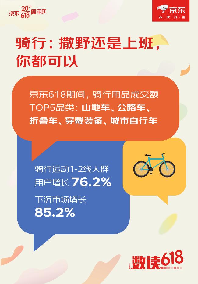 京東騎行數(shù)據(jù)顯示,騎行在今年應(yīng)該可以拿下增速最高的戶外類目頭牌。其中分(專業(yè)、非專業(yè)、泛潮)公路車、山地車、青少年自行車、電助力車、城市通勤自行車等,品類十分豐富,能很好地滿足騎行達(dá)人們的“步履不?!钡目犰胚\動生活。