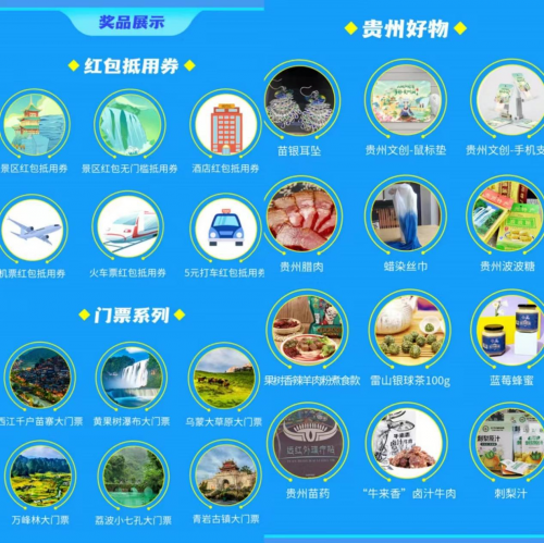本次盲盒活動獎品重點(diǎn)突出貴州省內(nèi)景點(diǎn)、文創(chuàng)產(chǎn)品、特色美食。從貴州重點(diǎn)景區(qū)如西江千戶苗寨、黃果樹瀑布、烏蒙大草原、荔波小七孔的大門票,到苗銀耳墜、貴州臘肉、蠟染絲巾、貴州波波糖、貴州苗藥等貴州好物,好玩、好吃、好用一應(yīng)俱全。此外,盲盒還提供景區(qū)、酒店、機(jī)票、火車票、打車紅包抵用券,誠意滿滿。