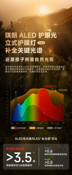 為此,琪朗以“為人類創(chuàng)造舒適的健康光環(huán)境”為使命,致力打造中國千萬兒童房專用護(hù)眼光環(huán)境。2022年,琪朗聯(lián)合中山大學(xué)中山眼科中心共同研發(fā)全新專利技術(shù)ALED護(hù)眼光。新一代ALED護(hù)眼光其原理是打造與太陽光的可見光譜接近的照明光譜,通過降低有害藍(lán)光峰值,補(bǔ)全孩子眼睛發(fā)育關(guān)鍵的紅光波段,緩解孩子近距離用眼疲勞,延緩近視發(fā)生發(fā)展。自從愛迪生發(fā)明光源以來,經(jīng)歷了白熾燈、鹵素?zé)簟晒鉄?、LED燈后,ALED護(hù)眼光是人類史上最近接太陽光譜的光源,其光源更護(hù)眼,更舒適,更健康。