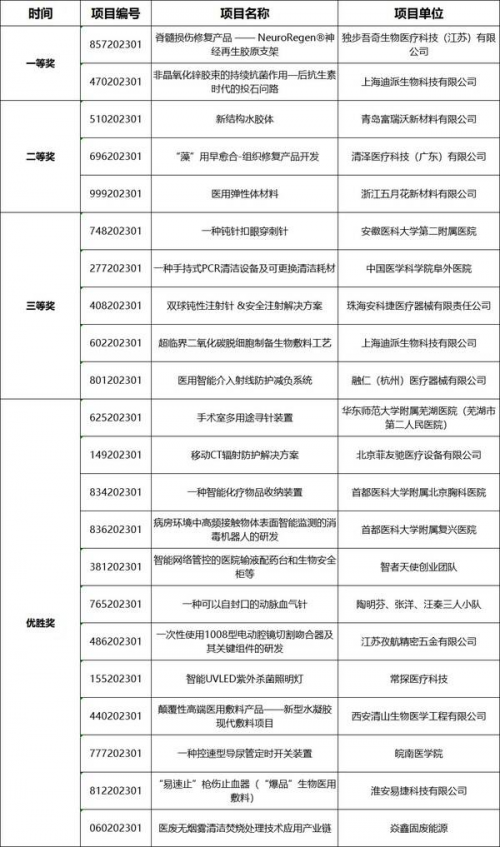 醫(yī)用材料類別賽獲獎(jiǎng)項(xiàng)目名單