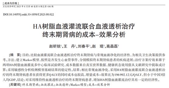 8月1日,國家衛(wèi)生健康委衛(wèi)生發(fā)展研究中心、國家藥物與衛(wèi)生技術(shù)綜合評估中心趙琨研究員等的研究成果《HA樹脂血液灌流聯(lián)合血液透析治療終末期腎病的成本-效果分析》發(fā)表于《衛(wèi)生經(jīng)濟(jì)研究》雜志。