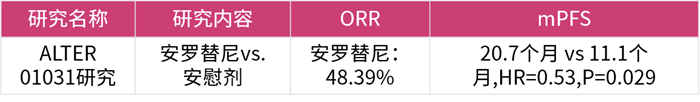 ALTER 01031的Ⅱ期隨機對照研究的結(jié)果表明,對比安慰劑,安羅替尼組的客觀緩解率(ORR)達(dá)到48.39%,可以顯著延長中位無進(jìn)展生存期(mPFS)達(dá)9.6個月(20.7個月 vs. 11.1個月)[8],為晚期MTC患者帶來顯著的PFS及ORR獲益,并且安全性良好。安羅替尼甲狀腺髓樣癌適應(yīng)癥的獲批,打破了國內(nèi)甲狀腺髓樣癌無靶向藥可用的局面,給患者帶來新希望。
