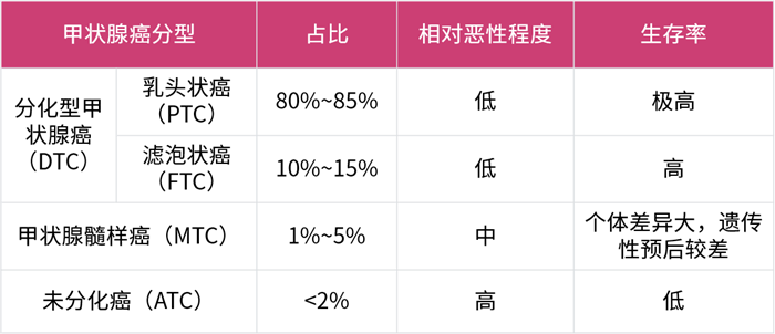 根據(jù)腫瘤起源及分化差異,甲狀腺癌主要分為乳頭狀癌、濾泡狀癌、未分化癌和髓樣癌。其中乳頭狀癌和濾泡狀癌又統(tǒng)稱為分化型甲狀腺癌(DTC),占所有甲狀腺癌的90%以上,而且大部分分化型甲狀腺癌患者可以長期生存,也就是大家常說的“幸福癌”。