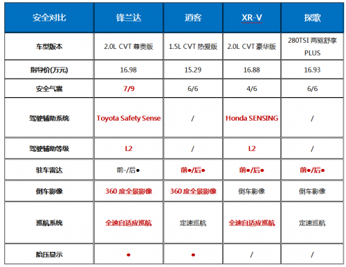 而在主動安全配置上,四款車型中僅有2款提供了選擇,分別為鋒蘭達搭載的T-PILOT智能駕駛輔助,以及XR-V的Honda SENSING駕駛輔助系統(tǒng),兩車的功能性方面均滿足L2級的自動駕駛。并且兩車的主動安全都近乎實現(xiàn)全系標(biāo)配,這也讓購車的消費者不用過多在主動安全以及更高的預(yù)算上左右為難。