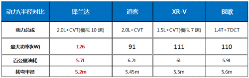 綜合幾款車的動力參數(shù)對比,可以發(fā)現(xiàn)在賬面數(shù)據(jù)上,鋒蘭達的動力表現(xiàn)明顯更有優(yōu)勢,得益于這款2.0L發(fā)動機的排量優(yōu)勢,其最大功率達到126kW,不管是與探歌的1.4T發(fā)動機,還是排量相同的逍客2.0L發(fā)動機,鋒蘭達都有著明顯的動力優(yōu)勢。