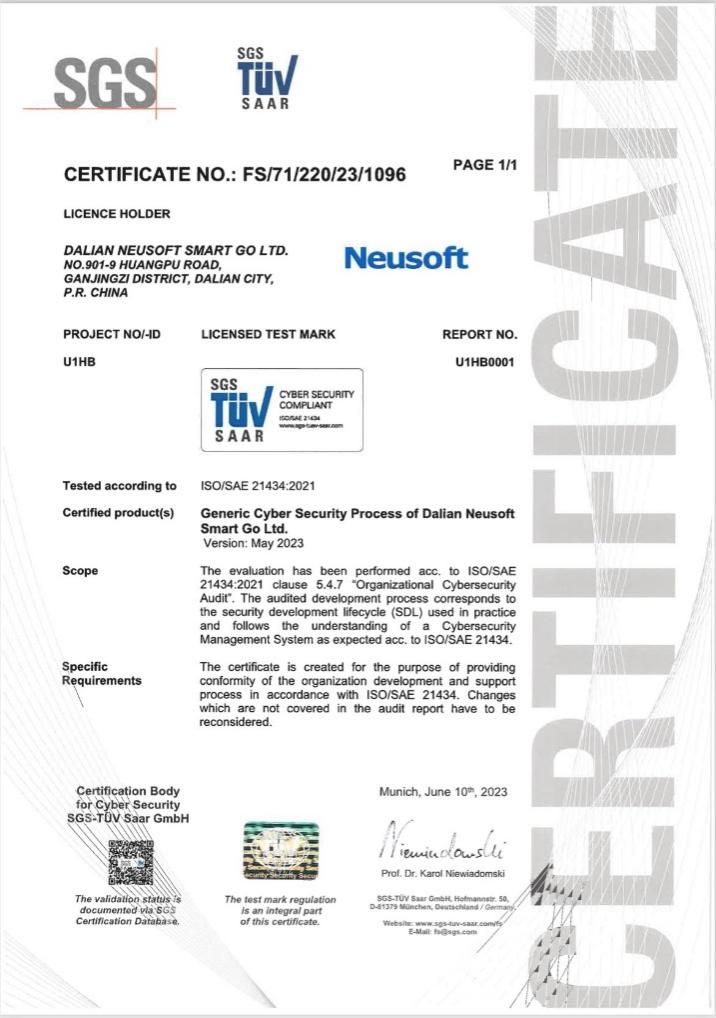 從產(chǎn)品開發(fā)到組織管理,東軟將汽車電子與網(wǎng)絡安全高度融合,形成一整套汽車網(wǎng)絡安全管理流程,覆蓋智能網(wǎng)聯(lián)汽車安全的整個生命周期,踐行對客戶持續(xù)全面保障網(wǎng)絡安全服務的鄭重承諾,也由此順利完成管理體系認證的全部內(nèi)容并獲得了認證證書,得到了SGS的高度稱贊。