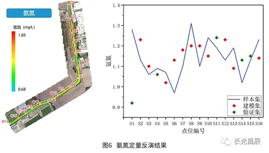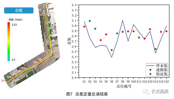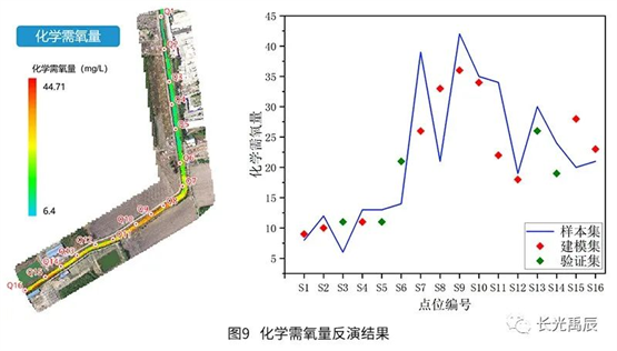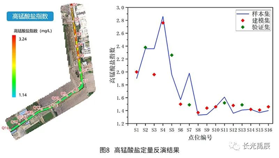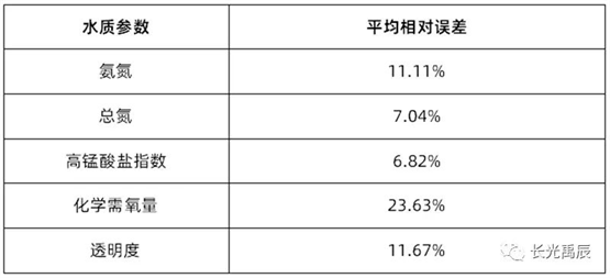 精度評定結(jié)果見表2.各水質(zhì)參數(shù)的平均相對誤差均在25%以下,可滿足常態(tài)化、高頻次的全局水質(zhì)檢測需求。化學需氧量反演誤差稍大是因為該條河道整體水質(zhì)情況存在較大的空間異質(zhì)性,河道不同河段中有機物含量差異較大,而水體化學需氧量與有機物濃度密切相關,所以這種變化較快的梯度可能會引入一定的誤差,模型也有繼續(xù)優(yōu)化的空間。