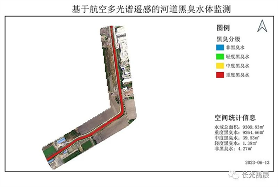 黑臭水體是指水質(zhì)污染嚴重、水體顏色異常、散發(fā)惡臭的情況。它通常由生活污水、工業(yè)廢水和農(nóng)業(yè)排放物等引起,造成環(huán)境破壞和健康風險。通過無人機多光譜遙感技術,結(jié)合水色與實測水質(zhì)參數(shù)數(shù)據(jù)的分析,對本次實驗河道黑臭水污染的識別情況如圖5所示。