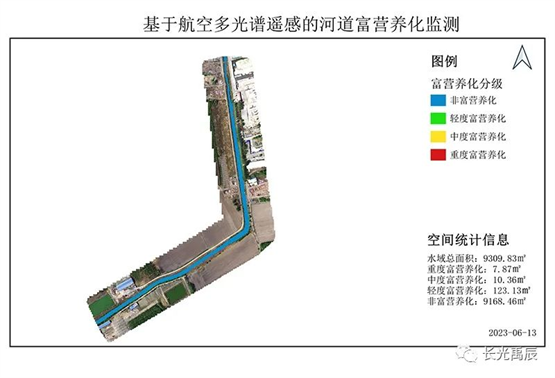 水體富營養(yǎng)化是指水中營養(yǎng)物質(zhì)(如氮、磷)過度積累,導致水體中藻類、水生植物大量繁殖的現(xiàn)象。水體富營養(yǎng)化會造成藻類過度生長,破壞水生態(tài)系統(tǒng)的平衡,甚至引發(fā)水體死亡。通過無人機多光譜遙感技術,結(jié)合實測水質(zhì)參數(shù)數(shù)據(jù)的分析,對本次實驗河道水體富營養(yǎng)化的識別情況如圖4所示。