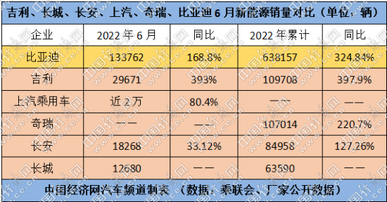 中國(guó)經(jīng)濟(jì)網(wǎng)記者通過(guò)梳理廠家公開(kāi)的數(shù)據(jù)和乘聯(lián)會(huì)發(fā)布的數(shù)據(jù)發(fā)現(xiàn),6月,比亞迪乘用車(chē)、吉利、長(zhǎng)安乘用車(chē)、長(zhǎng)城的銷(xiāo)量分別為133762輛、126595輛、118303輛、101186輛,同比分別上漲168.8%%、26%、37.6%、0.52%;上半年累計(jì)銷(xiāo)量分別為641350輛、613842輛、629175輛、518525輛,同比分別上漲314.9%、-3%、-4.61%、-16.12%。?