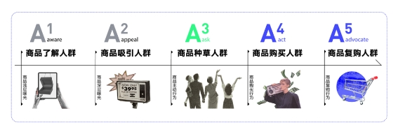 具體到5A維度,商品A1與A2聚焦用戶商品曝光行為,商品A3聚焦用戶的商品主動行為,如商品點擊、收藏、加購等,商品A4、A5則更側重抖音域內(nèi)用戶的商品購買和復購行為,通過科學的分層,清晰呈現(xiàn)指定商品在抖音域內(nèi)的種草與轉化效率。