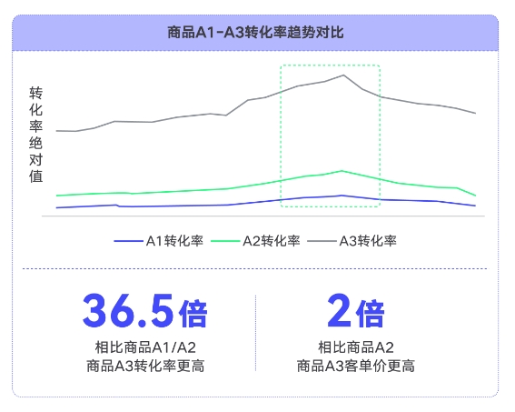 此外,商品5A從生意結果出發(fā),建立了人群商品行為和生意的關聯(lián)。其中,商品A3的樞紐價值尤其值得關注。相比商品A1/A2,商品A3的轉化率高出36.5倍;相比商品A2,商品A3的客單價高出2倍。這意味著在抖音生態(tài)內(nèi),商品A3人群對商品的喜愛程度更高,且更愿意購買該商品。品牌商家可以重點錨定商品A3人群進行種草,放大營銷效果,在市場競爭中占據(jù)優(yōu)勢。