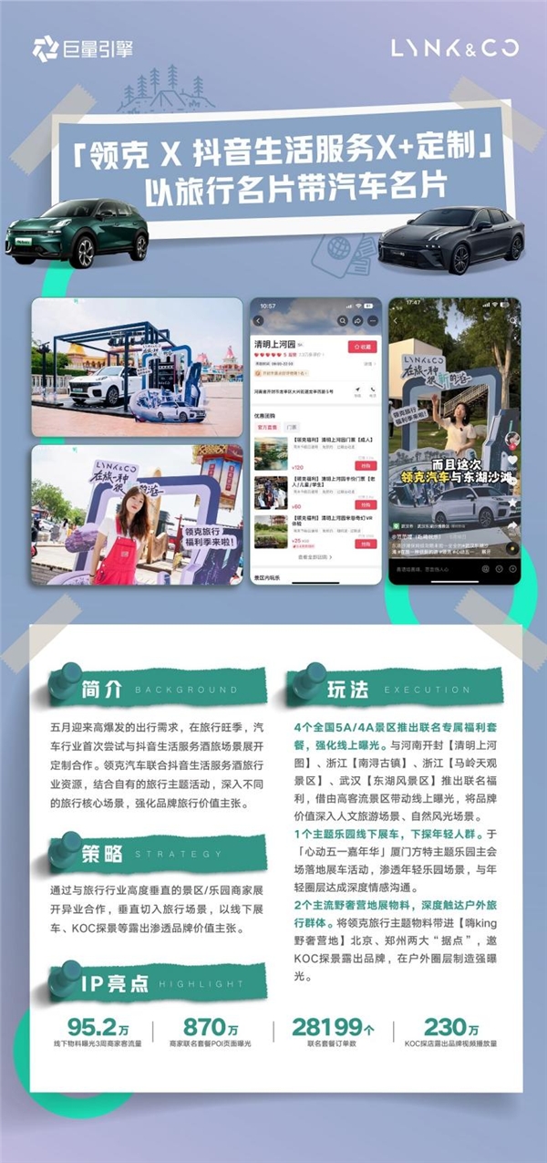 針對領(lǐng)克汽車亟需打響“旅游出行必選車”的需求,抖音生活服務(wù)酒旅商家首次與汽車客戶領(lǐng)克進(jìn)行聯(lián)動,將領(lǐng)克汽車帶進(jìn)全國景區(qū)、主題樂園、營地等旅行場景,推動“汽車+旅游”新融合,宣揚(yáng)“領(lǐng)克汽車=旅行新選擇”品牌價(jià)值主張。