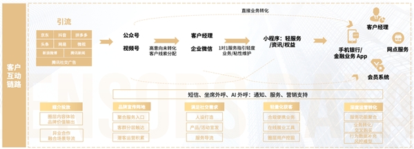 金融企業(yè)在客戶全鏈路互動(dòng)與經(jīng)營上,涉及到的渠道觸點(diǎn)也比較多。通常,在引流階段,客戶通過交易型 App、資訊類 App、種草媒體等進(jìn)行互動(dòng),之后進(jìn)入公眾號(hào)、視頻號(hào)為主的公私域轉(zhuǎn)換的形態(tài),如果轉(zhuǎn)化周期較長,還會(huì)通過客戶經(jīng)理和企業(yè)微信進(jìn)行 1V1 服務(wù)引導(dǎo)和關(guān)系維護(hù),還可以直接導(dǎo)量到小程序或 H5 進(jìn)行輕轉(zhuǎn)化,以及到手機(jī)銀行、金融業(yè)務(wù) App,結(jié)合客戶經(jīng)理、網(wǎng)點(diǎn)服務(wù)和會(huì)員系統(tǒng)加強(qiáng)后鏈路深度運(yùn)營。