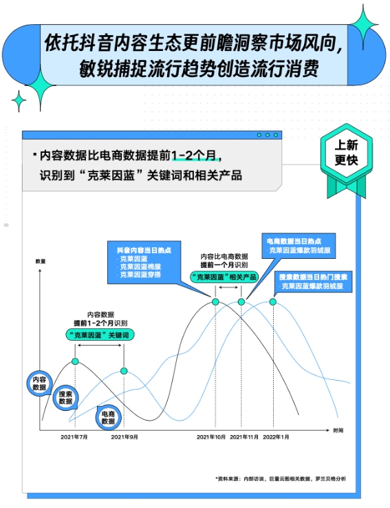 看似無序的消費決策遵循一套基礎(chǔ)邏輯,比如購買普遍發(fā)生在瀏覽和搜索之后。所以,內(nèi)容數(shù)據(jù)和搜索數(shù)據(jù)可以被視為交易的前置指標,它們能夠更早預(yù)測未來交易走向。正是基于這一結(jié)論,擁有內(nèi)容場監(jiān)測能力的巨量云圖能更快識別出新品市場機會,為品牌上新提供參考。