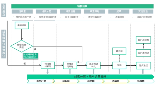 當(dāng)前,教培企業(yè)大多面臨著“大量公海線索難以管理,傳統(tǒng)電銷方式不僅耗費(fèi)人力還打擾用戶”的困境,因此,設(shè)計一套可落地的線索分層培育體系是十分必要的。