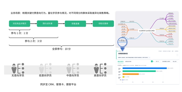 當(dāng)學(xué)員與課程產(chǎn)品交互越多,用戶畫像就會越豐富,班主任對學(xué)員的復(fù)購、進(jìn)階意向也就掌握得更精準(zhǔn),通過量化學(xué)員關(guān)鍵行為,及時跟進(jìn)高意向?qū)W員,并對不同群體采取差異化銷售策略,以此提高學(xué)員復(fù)購率。