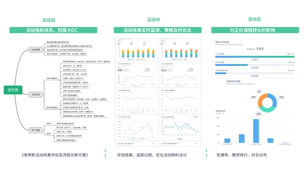活動后:分析活動對用戶活躍層級、消費(fèi)層級的整體影響,選出活動最受歡迎的課程和老師,迭代下一輪活動策略。