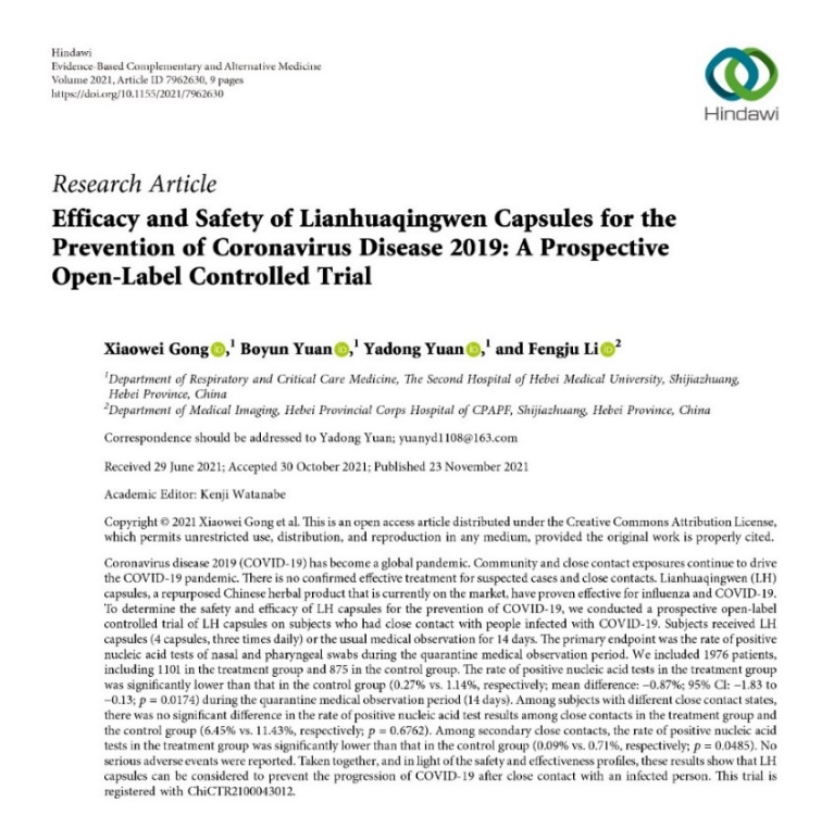 連花清瘟膠囊/顆粒預(yù)防新冠肺炎的作用得到了臨床研究的證實。前不久,由河北醫(yī)科大學(xué)第二醫(yī)院呼吸與危重癥醫(yī)學(xué)二科主任袁雅冬教授主持開展的“連花清瘟膠囊預(yù)防新型冠狀病毒肺炎”真實世界研究論文被國際權(quán)威期刊《循證補充和替代醫(yī)學(xué)》刊發(fā)。該論文指出,連花清瘟膠囊在有效治療流感、新冠肺炎COVID-19的同時,兼具預(yù)防新冠肺炎的作用,為新冠疑似病例和密切接觸者提供了新的治療方案。