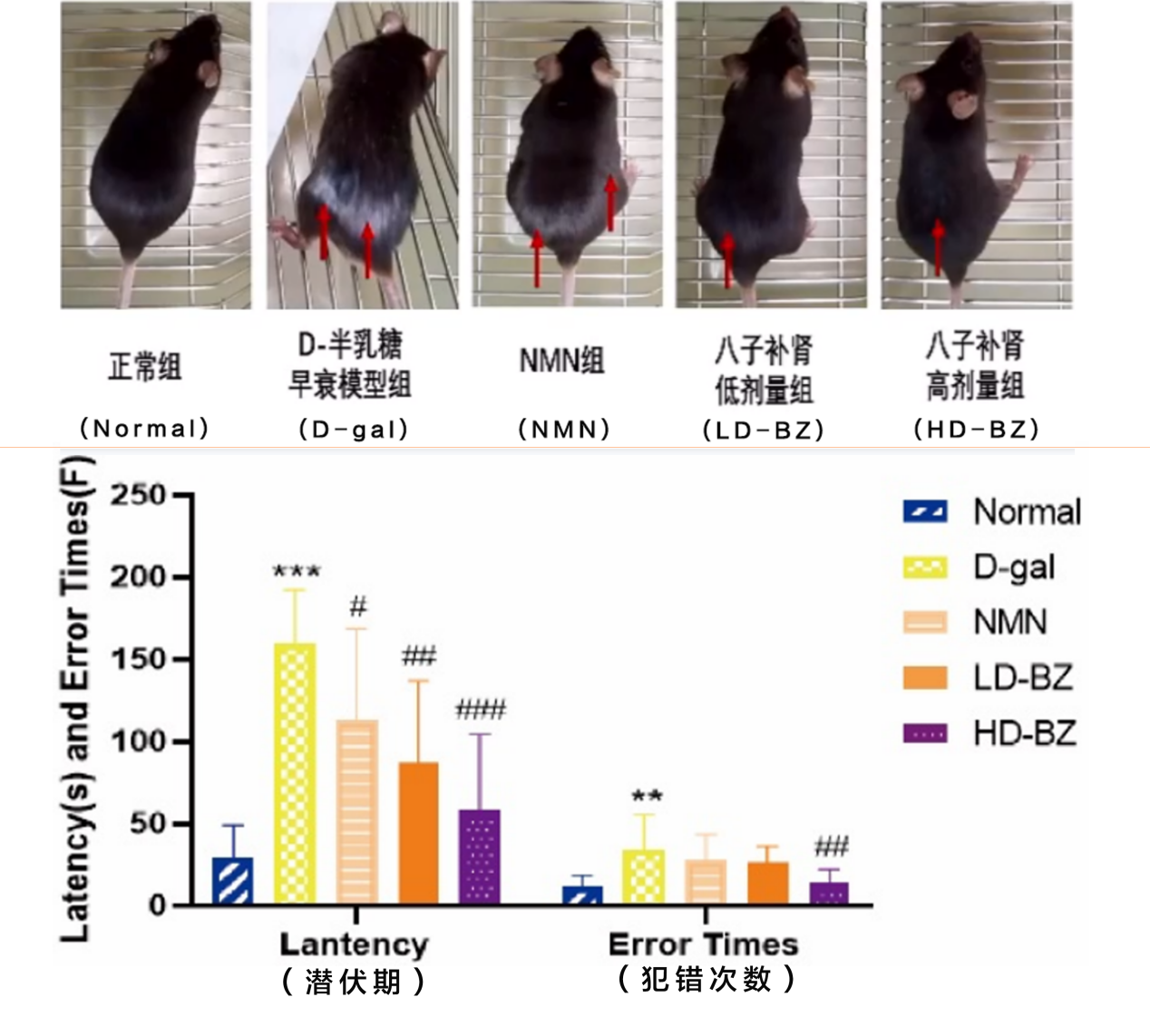 北京中醫(yī)藥大學(xué)科研人員采用D-gal誘導(dǎo)衰老小鼠模型,連續(xù)給藥60日,評價八子補腎膠囊改善腦功能的效果及作用機(jī)制。巴恩斯迷宮實驗結(jié)果表明,八子補腎組小鼠在縮短逃避潛伏期、減少犯錯次數(shù)上均有明顯作用(P<0.001;P<0.01)。