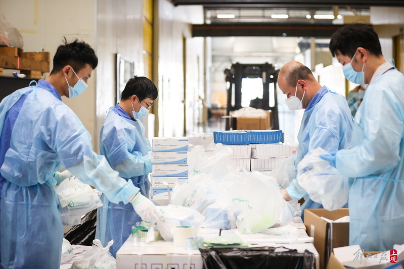 2022年4月11日,上觀新聞記者來到業(yè)績路上的寶山防疫服務(wù)包最大的分裝車間,這里原本是上海漢虹精密機械有限公司的生產(chǎn)廠房,但該廠百余名志愿者從早上八點就開始分批次投入到了防疫物資的分裝“流水線”作業(yè)中,一張張清單核對,一件件物資分裝,現(xiàn)場熱火朝天。