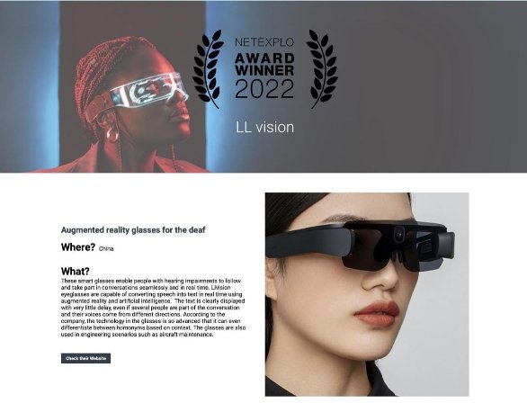 值得關(guān)注的是,在今年的評選中,亮亮視野智能AR字幕眼鏡成為唯一入選該獎的中國代表,也是AR領(lǐng)域的唯一代表。在活動期間Netexplo論壇官網(wǎng)面向全球觀眾進(jìn)行了一個投票活動,從10項創(chuàng)新中選出年度最佳創(chuàng)新成果,亮亮視野智能AR字幕眼鏡脫穎而出,與第一名票數(shù)極其接近,獲得第二名,彰顯了大眾對它的肯定和期待。