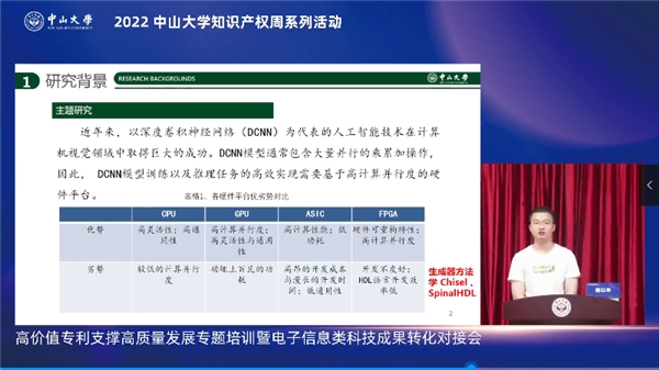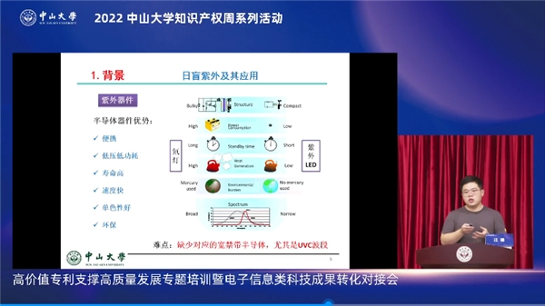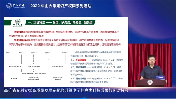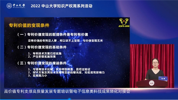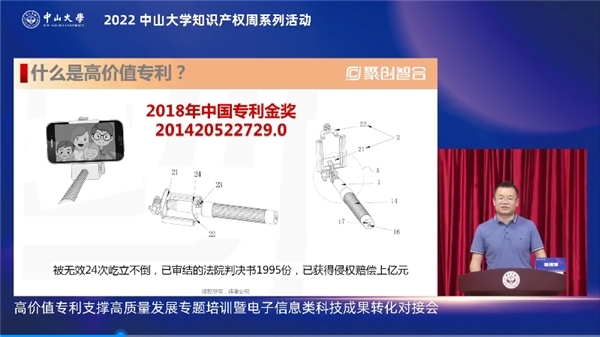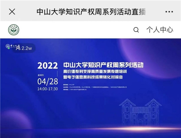 2022年4月28日,在中山大學(xué)的全程指導(dǎo)及越秀區(qū)政府的鼎力支持下,中山大學(xué)科學(xué)研究院、廣州高新區(qū)黃花崗科技園管委會(huì)、中山大學(xué)圖書館、廣州中大知識(shí)產(chǎn)權(quán)服務(wù)有限公司共同成功主辦中山大學(xué)知識(shí)產(chǎn)權(quán)周系列活動(dòng)高價(jià)值專利支撐高質(zhì)量發(fā)展專題培訓(xùn)暨電子信息類科技成果轉(zhuǎn)化對(duì)接會(huì)。本次活動(dòng)采取線上方式開展,邀請(qǐng)兩位業(yè)界專家圍繞高價(jià)值專利支撐高質(zhì)量發(fā)展做專題報(bào)告,多達(dá)178項(xiàng)電子信息類專利項(xiàng)目與83家企業(yè)進(jìn)行了精準(zhǔn)對(duì)接,活動(dòng)在線人數(shù)超2.2萬人,多位知識(shí)產(chǎn)權(quán)專家及知名企業(yè)在云端匯聚,助力知識(shí)產(chǎn)權(quán)高質(zhì)量發(fā)展。