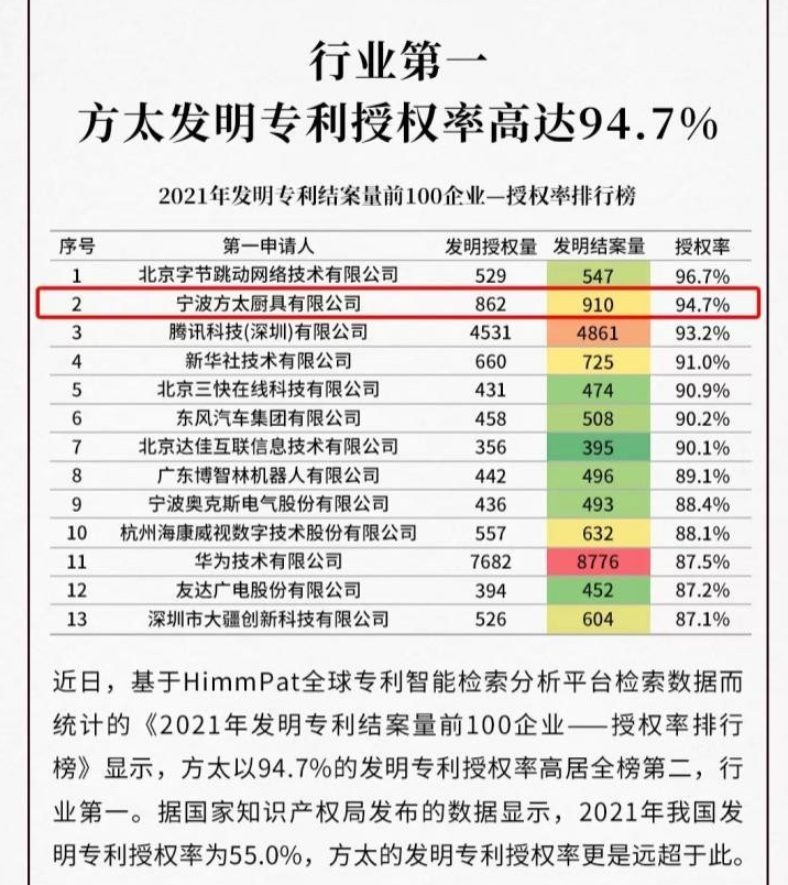 近日,基于HimmPat全球?qū)@悄軝z索分析平臺(tái)檢索數(shù)據(jù)而統(tǒng)計(jì)的《2021年發(fā)明專(zhuān)利結(jié)案量前100企業(yè)——授權(quán)率排行榜》顯示,廚電龍頭企業(yè)方太以94.7%的發(fā)明專(zhuān)利授權(quán)率高居全榜第二,行業(yè)第一。據(jù)國(guó)家知識(shí)產(chǎn)權(quán)局發(fā)布的數(shù)據(jù)顯示,2021年我國(guó)發(fā)明專(zhuān)利授權(quán)率為55.0%,方太的專(zhuān)利授權(quán)率遙遙領(lǐng)先。
