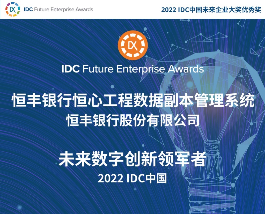 9月1日,IDC中國正式發(fā)布2022IDC中國未來企業(yè)大獎優(yōu)秀案例獲獎名單,恒豐銀行憑借恒心工程數(shù)據(jù)副本管理系統(tǒng)項目獲評“未來數(shù)字創(chuàng)新領(lǐng)軍者”優(yōu)秀獎。