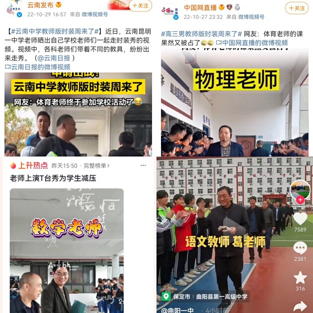記者了解到,由于受疫情影響,不少學(xué)校采取了封控措施,為了豐富校園生活,減緩壓力,一些老師突發(fā)奇想,在校園中開展“時(shí)裝走秀”活動(dòng),并將視頻上傳至微信、微博、抖音等社交平臺(tái),收獲了廣泛好評(píng)。之后,各地學(xué)校紛紛模仿,尤其是許多初高中任課老師“申請(qǐng)出戰(zhàn)”,希望通過(guò)展現(xiàn)自己的“另一面”, 讓那些背負(fù)升學(xué)壓力的同學(xué)們的緊張情緒得到有效釋放。