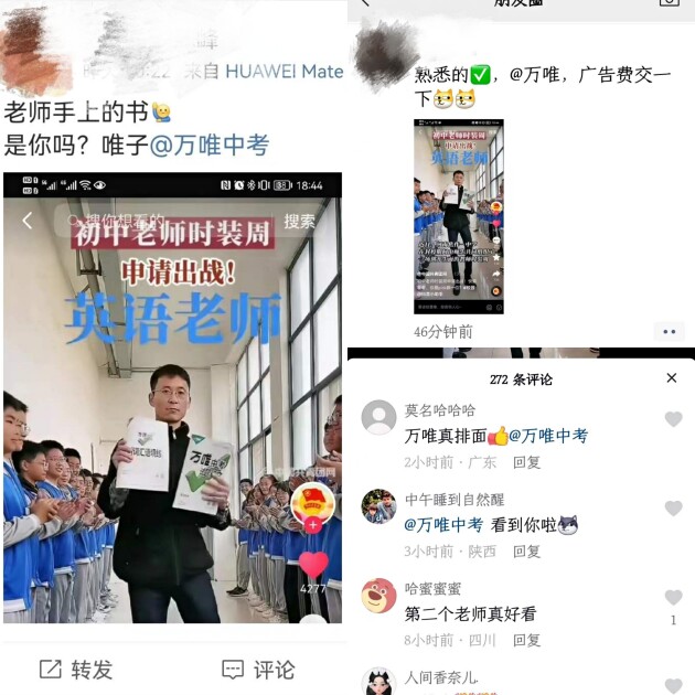 “王老師穿西服好帥啊”“吳老師真像標(biāo)準(zhǔn)的模特”“期待下一場(chǎng)老師T臺(tái)秀”……記者發(fā)現(xiàn),該視頻得到了大量點(diǎn)贊轉(zhuǎn)發(fā),幾乎每一位老師都收獲了大量評(píng)論和“粉絲”,尤其一位舉著英語(yǔ)資料的男教師,令許多網(wǎng)友驚呼仿佛又要考試了。原來(lái),除了男老師“冷酷”的表情使大家聯(lián)想到自己曾經(jīng)嚴(yán)肅的老師外,還因?yàn)樗掷锱e著一本《萬(wàn)唯中考試題研究》。據(jù)了解,《萬(wàn)唯中考試題研究》在全國(guó)30個(gè)省(區(qū)市)的初中校園中廣泛使用,因此當(dāng)它出現(xiàn)時(shí),不少網(wǎng)友直呼“熟悉”“青春回來(lái)了”。