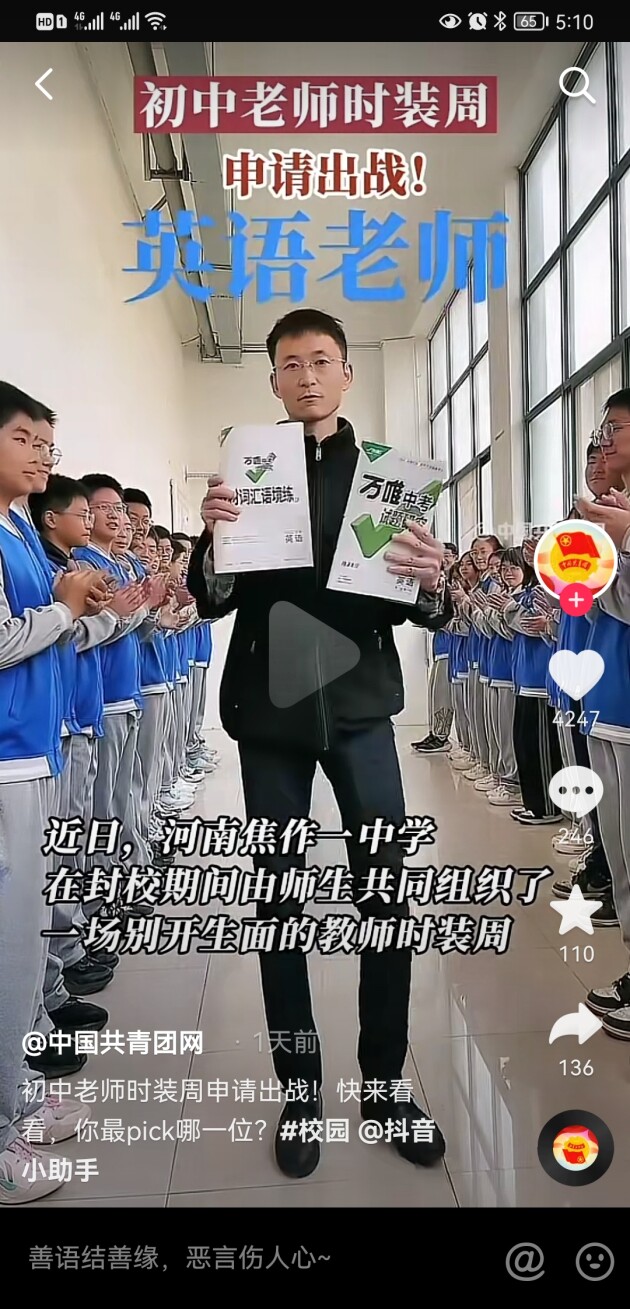 記者還注意到,“老師時(shí)裝秀”的相關(guān)視頻覆蓋面非常廣泛,在吉林、河北、河南、陜西、安徽、云南等多地校園均有出現(xiàn),其中一段河南焦作的“走秀”短視頻更是得到了中國(guó)共青團(tuán)網(wǎng)抖音賬號(hào)的轉(zhuǎn)發(fā)。據(jù)悉,該視頻來(lái)源于焦作的一所初中,語(yǔ)文、數(shù)學(xué)、英語(yǔ)、物理等各科老師幾乎都參與了“走秀”,學(xué)生們?cè)谝慌院炔使恼?#xff0c;每個(gè)人臉上都洋溢著歡樂(lè)的笑容。