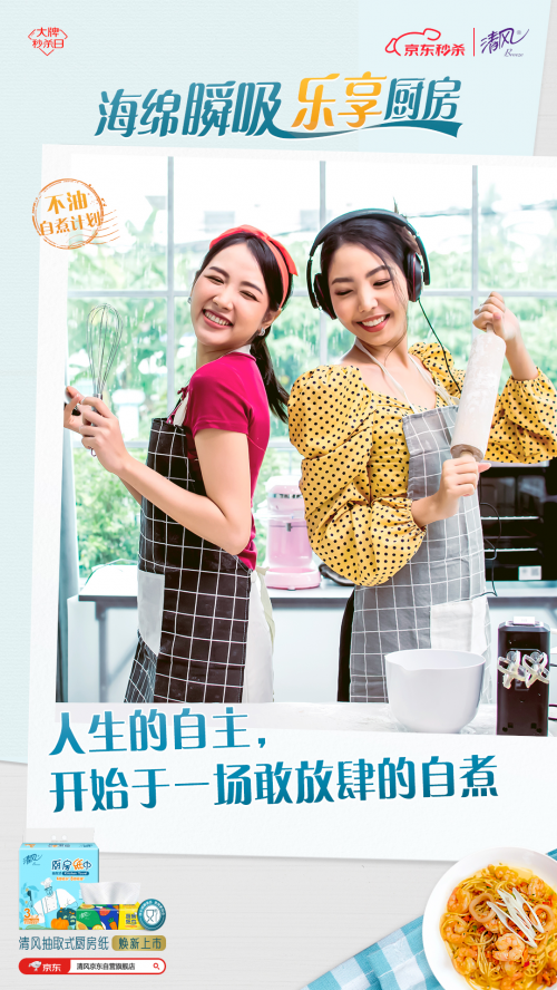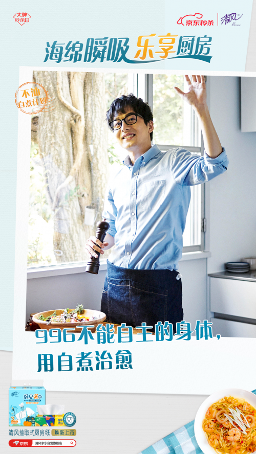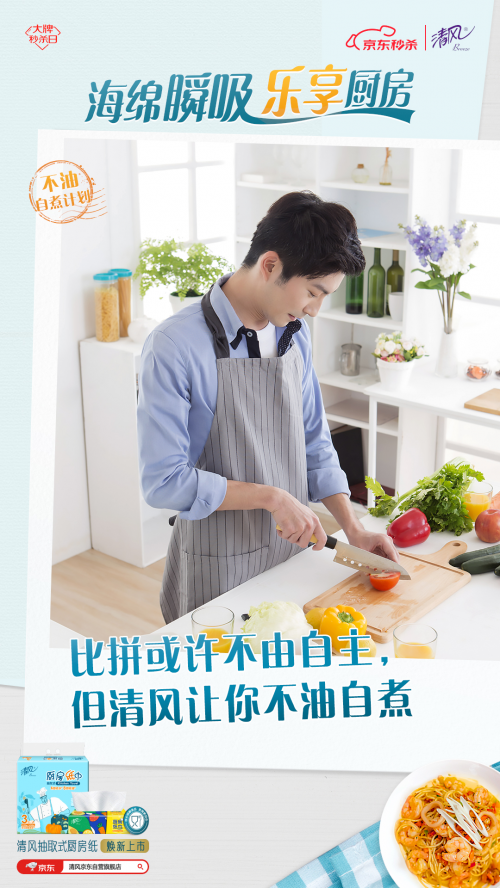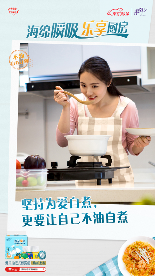 為此,清風(fēng)推出“不油自煮計(jì)劃”, 以煥新上市的清風(fēng)海綿吸廚房紙巾為依托,用“一抹即凈”的不油體驗(yàn)和“一掃就會”的自煮攻略,幫助用戶破除廚房恐懼,給不同身份的用戶輕松自煮不油膩的廚房體驗(yàn),讓TA們能不由自主地愛上烹飪,輕松享受做飯帶來的快樂。