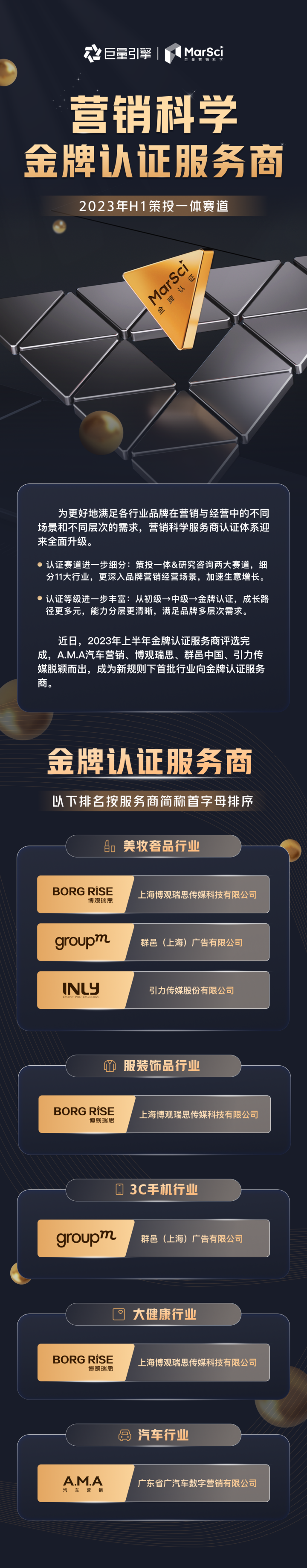 注:除金牌認(rèn)證服務(wù)商外,營銷科學(xué)服務(wù)生態(tài)基于全新規(guī)則,對現(xiàn)有生態(tài)服務(wù)商重新進(jìn)行了等級評定和認(rèn)證周期授予,評選出了2023年首批初級和中級認(rèn)證服務(wù)商。