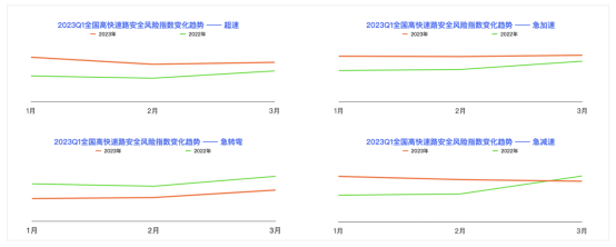 數(shù)據(jù)顯示,全國(guó)高快速路的安全險(xiǎn)指數(shù)環(huán)比2022第四季度下降8.16%,全國(guó)高快速路的危險(xiǎn)駕駛行為(即三急一超:急加速、急減速、急轉(zhuǎn)彎和超速)與2022第一季度比較,超速、急轉(zhuǎn)彎的變化趨勢(shì)一致,急加速、急減速則在2023年3月呈現(xiàn)下降向好趨勢(shì)。