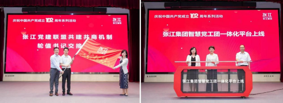 張江黨建聯(lián)盟第三屆輪值書記交接儀式(左)、張江集團(tuán)智慧黨工團(tuán)一體化平臺(tái)上線(右)